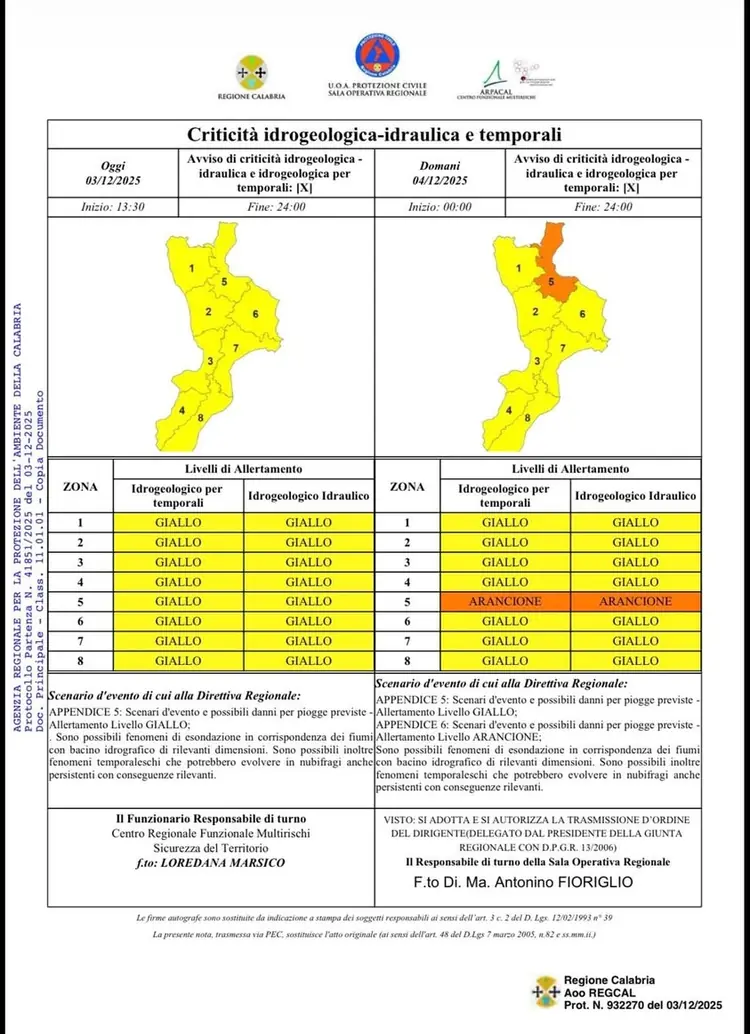 ALLERTA METEO ARANCIONE – DATA 4 DICEMBRE 2025 La Protezione Civile Calabria ha diramato un' ALLERTA METEO ARANCIONE a partire dalle 00:00 di oggi e fino alle 24:00 di domani. PREVISIONI: ⛈️ Piogge diffuse, rovesci e temporali localmente intensi, forti raffiche di vento e possibili grandinate. RA